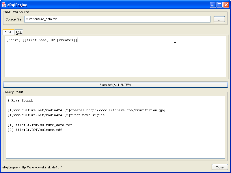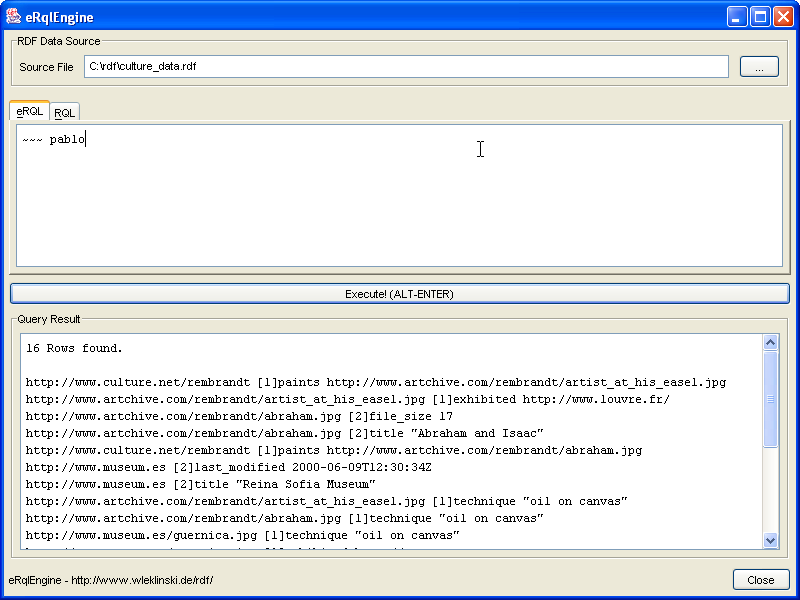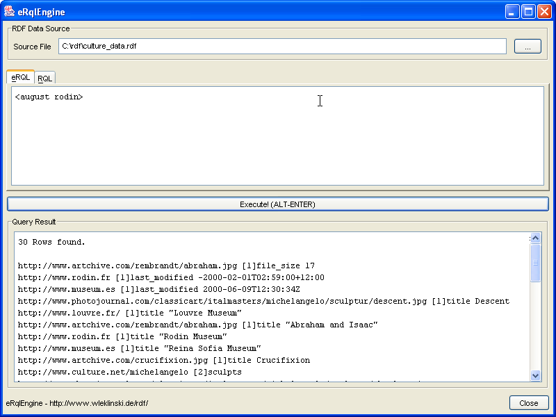 eRqlEngine ist die prototypische Implementierung eines eRQL-Prozessors, und wurde im Rahmen der Diplomarbeit Suche im Semantic Web von Fabian Wleklinski erstellt. Hier finden Sie eRqlEngine mit und ohne Quelldateien zum Downloaden. Zusätzlich gibt es ein Archiv mit beigelegter JRE, welches auch auf Rechnern ohne Java-Installation einen schnellen Start ermöglicht. Wenn Sie Sich nicht sicher sind, welches Packet Sie benötigen, sollten Sie das erste Packet wählen: